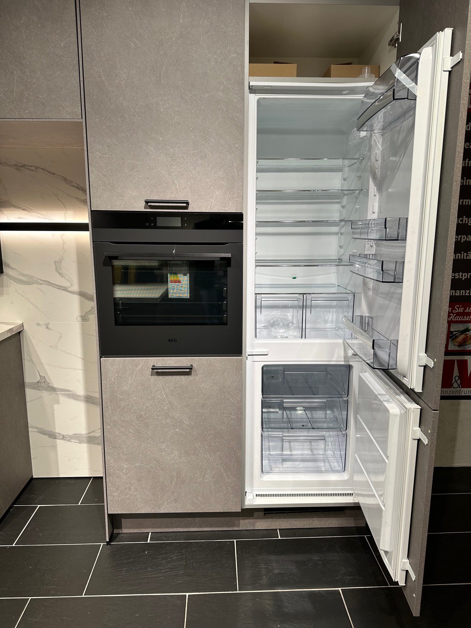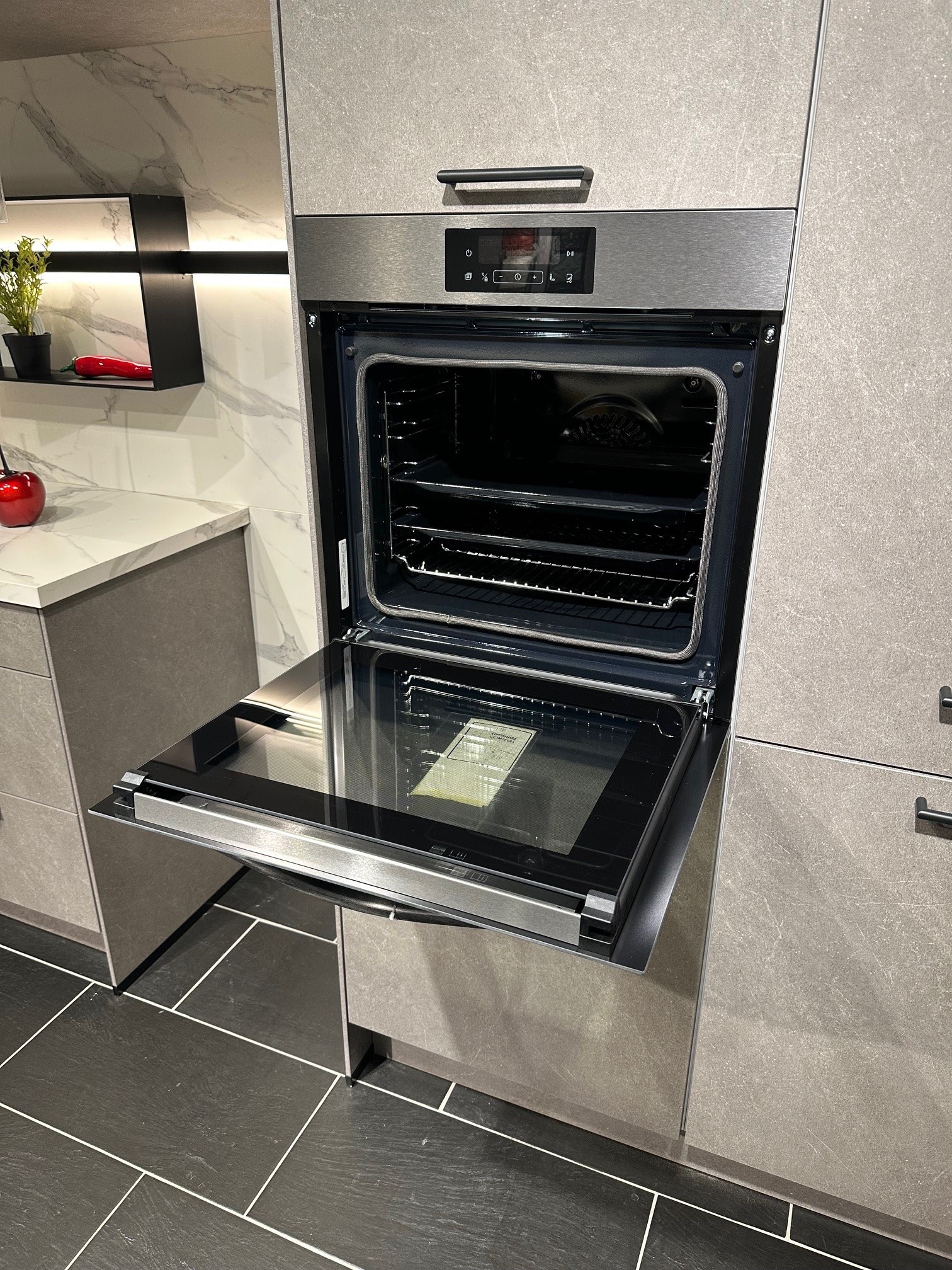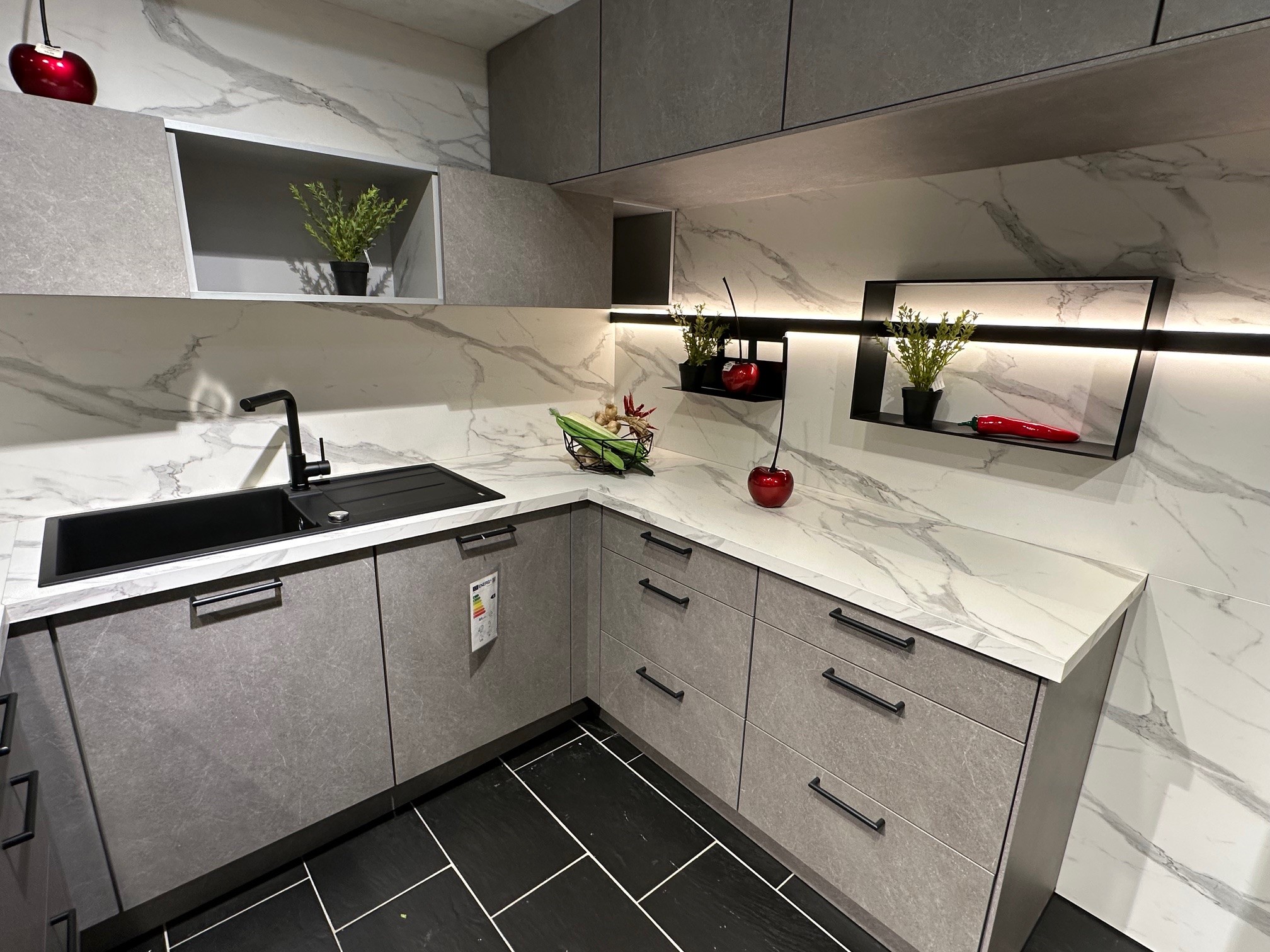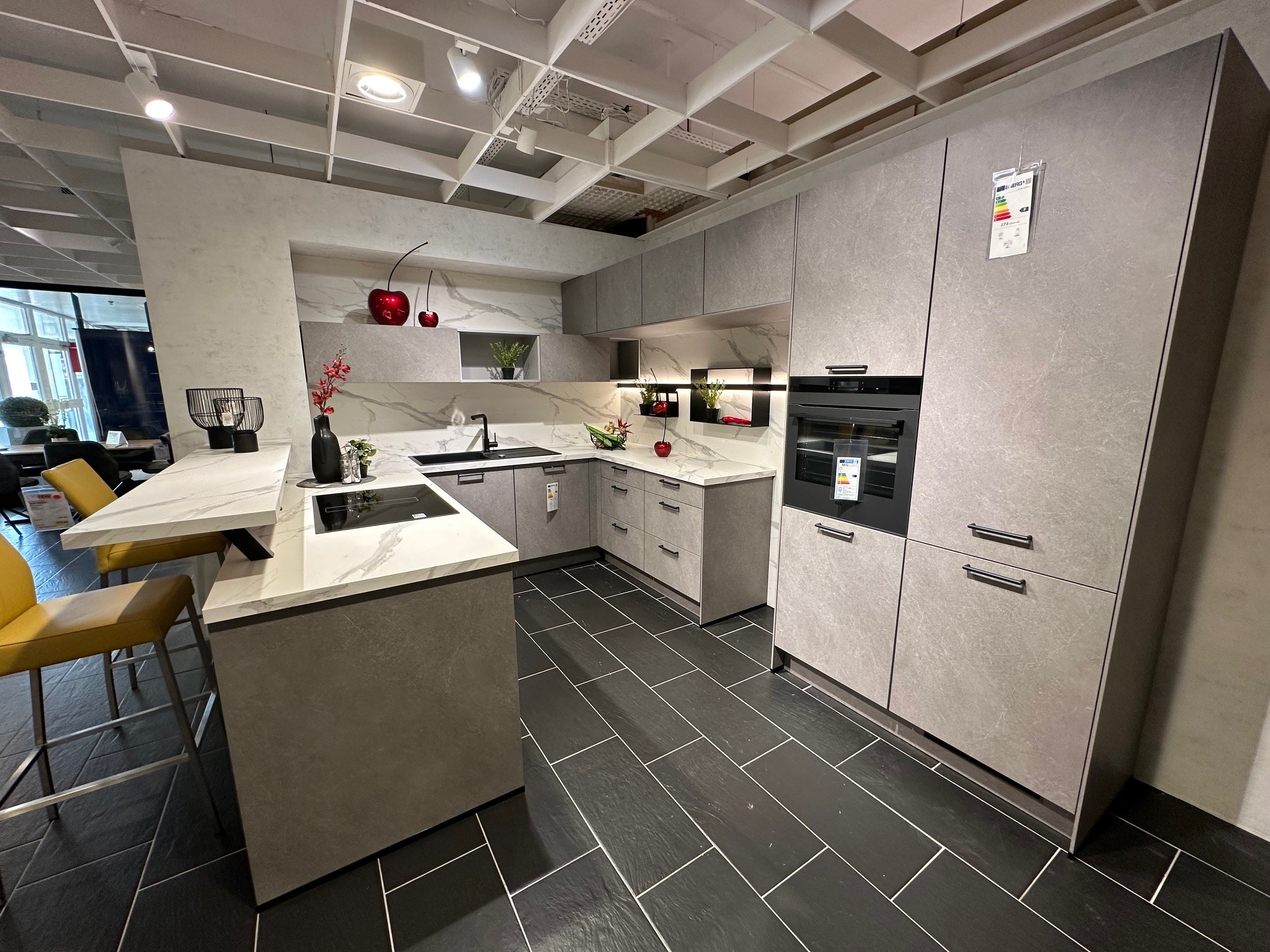 Diese hochwertige Aktionsküche von Nobilia überzeugt durch ihre edle Farbgestaltung: Die Front in Basalt Taupergrau harmoniert perfekt mit der Arbeitsplatte in Schiefergrau und dem Korpus in Steingrau – ein stilvoller Look, der zeitlos modern wirkt.