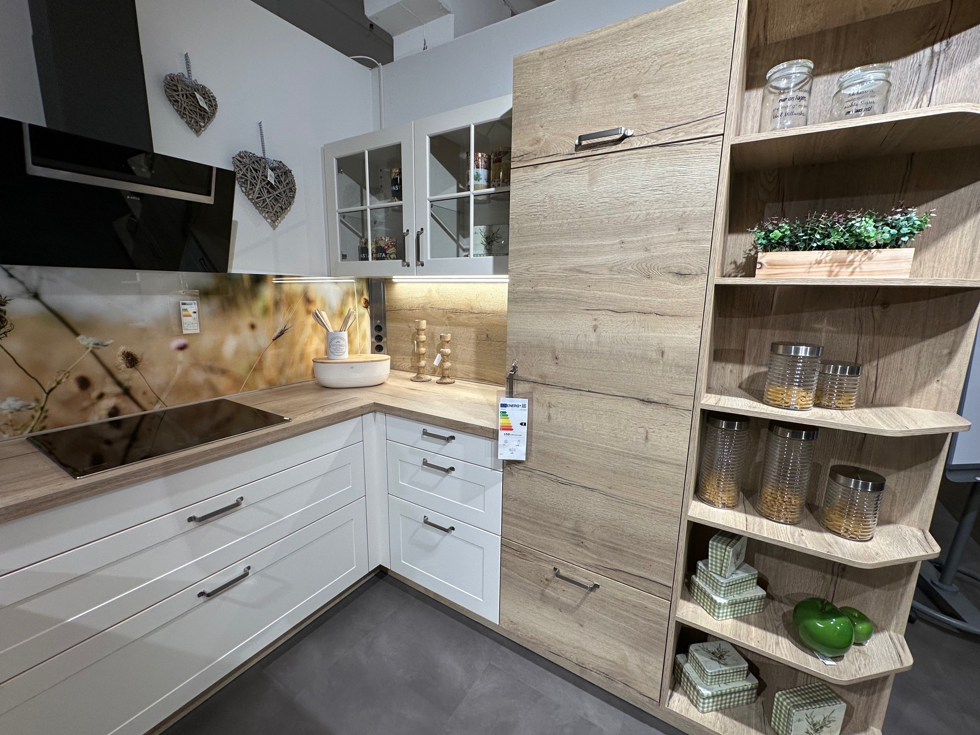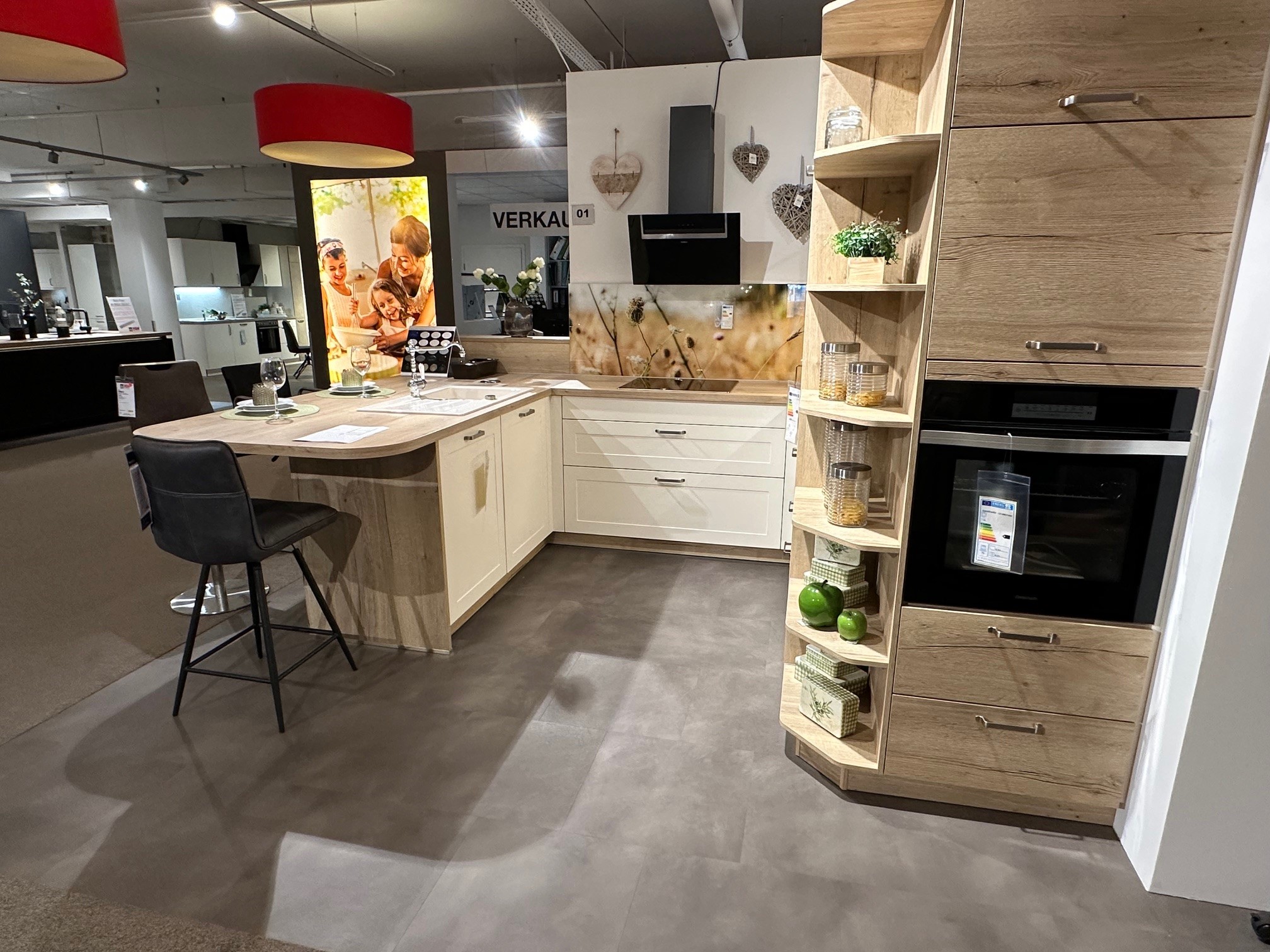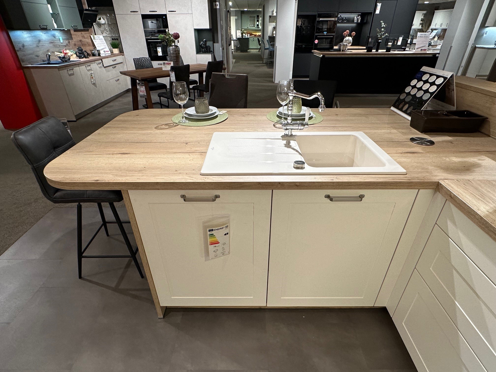 Erleben Sie modernes Küchendesign und höchste Funktionalität mit unserer Aktionsküche des Herstellers Wert. Die Fronten in edlem Satinlack Magnolia strahlen zeitlose Eleganz aus und harmonieren perfekt mit der Arbeitsplatte und dem Korpus in Alteiche Provence Nachbildung. So entsteht ein wohnlicher und stilvoller Look, der Ihre Küche zum Highlight des Zuhauses macht.