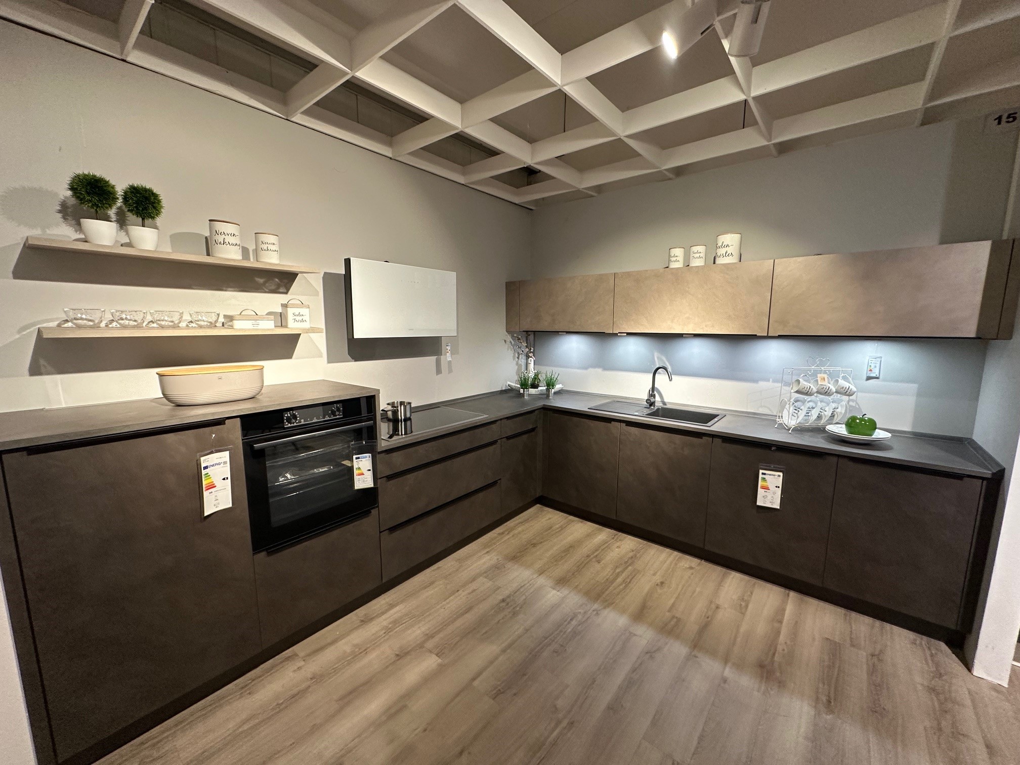 Diese hochwertige Aktionsküche von Interliving überzeugt durch ihr modernes Erscheinungsbild in Zement Anthrazit für Front und Arbeitsplatte. Der Korpus in Quarzgrau sorgt für eine elegante und zugleich zeitlose Kombination, die Ihrem Zuhause ein edles Ambiente verleiht.