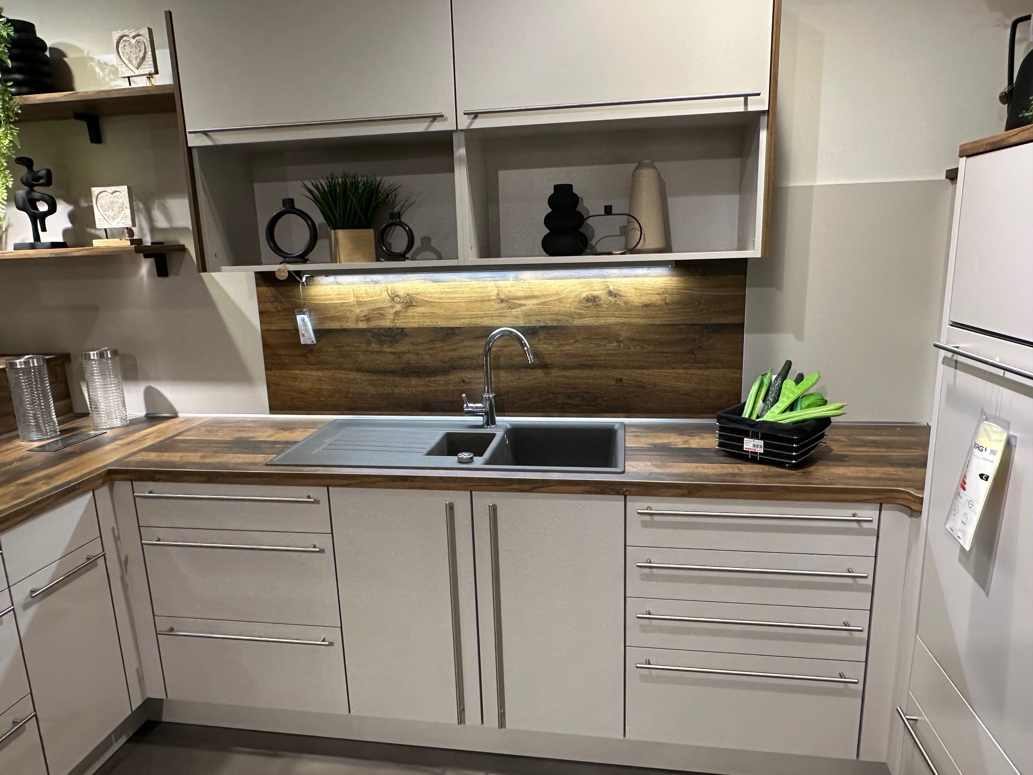 Diese hochwertige Aktionsküche von Nobilia überzeugt mit einer eleganten Front in Sand sowie einer warmen Arbeitsplatte in Balkeneiche-Nachbildung. Der passende Korpus in Sand rundet das harmonische Gesamtbild perfekt ab.